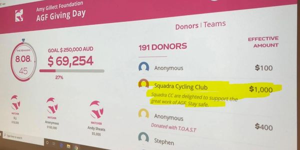24 May 2021....Established in 2006, the AGF has evolved to become the leading cycling safety organisation in Australia, driven by a core mission to reduce the death and injury of cyclists. AGF Board Member and Squadra cyclist, Justin Williams said, "Squadra's $500 donation will be doubled on Giving Day and will go towards investments in research, education and advocacy - everything we do is to make it safe for people to ride home to what’s important. Thank you Squadra"